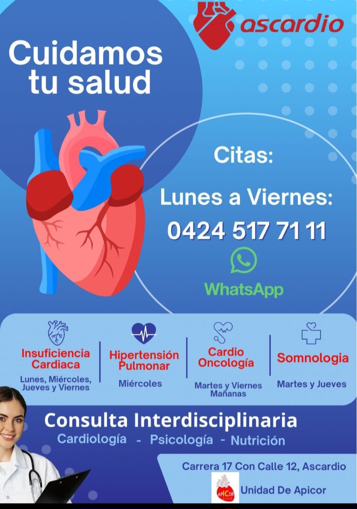 ASCARDIO es una asociación civil sin fines de lucro dedicada a la prevención y tratamiento de las enfermedades cardiovasculares. Con sede en Barquisimeto, Estado Lara, Venezuela. Fundada el 25 de marzo de 1976. Somos un equipo multidisciplinario, donde nuestroe médicos cuenta con una amplia experiencia en las diversas ramas de cardiología, con un personal técnico y de enfermeria altamente capacitado para la atención de pacientes cardiológicos, apoyados por expertos en rehabiltación, nutriólogos, especialistas en imagen cardiovascular e ingenieros biomédicos.
